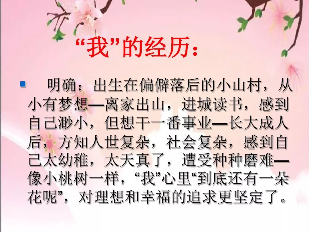 本文描写了一棵在逆境中诞生,在逆境中成长,历经风雨仍顽强生存的小桃树,赞颂了小桃树顽强同命运抗争的精神。揭示了一个生活的哲理:不屈不挠的奋斗,定会战胜磨难,创造出美好的未来。