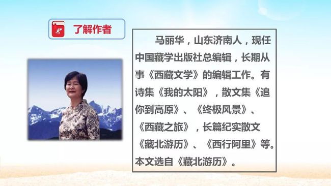 马丽华,山东济南人。1976年开始发表作品,著有长篇散文《藏北游历》《西行阿里》《灵魂像风》,报告文学《青藏苍茫》,散文集《终极风景》《追你到高原》,诗集《我的太阳》,长篇小说《如意高地》等。被誉为“西藏的歌者和行者”。