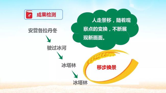4.运用想象的表现手法,由冰山的裂纹和皱褶想象到漫长时光里冰川的前进和后退,并通过对“是否就是年轮”的疑问,表现了作者对冰山奇景的惊叹,对大自然鬼斧神工的赞美。点拨:要认真阅读课文和所给例句,确定引发感想的“点”,即感受最深的地方。然后分析写作技法,用简练的语言把自己的真实感受表述出来。