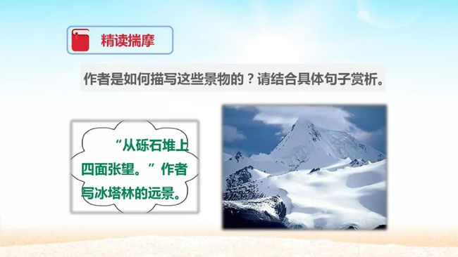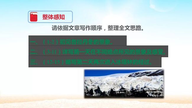 二、作者描写各拉丹冬的冰塔林奇观是按照移步换景的游踪顺序进行描绘的。首先从砾石堆上四面张望,晶莹连绵的冰峰、平坦辽阔的冰河历历在目;然后沿冰河接近冰山,发现整座冰塔林就由许多冰的庄园冰的院落组成,自成一天地;最后置身冰窟里,听到四周都是川流不息的风声,看见了形态各异的冰体。