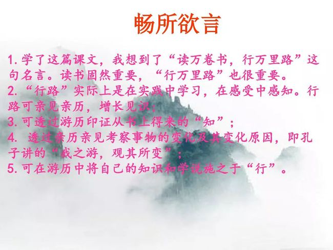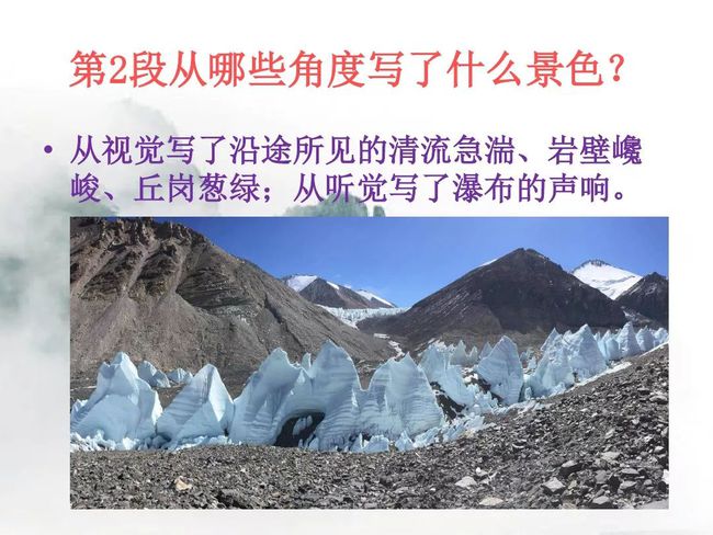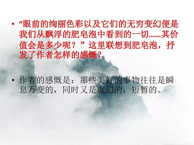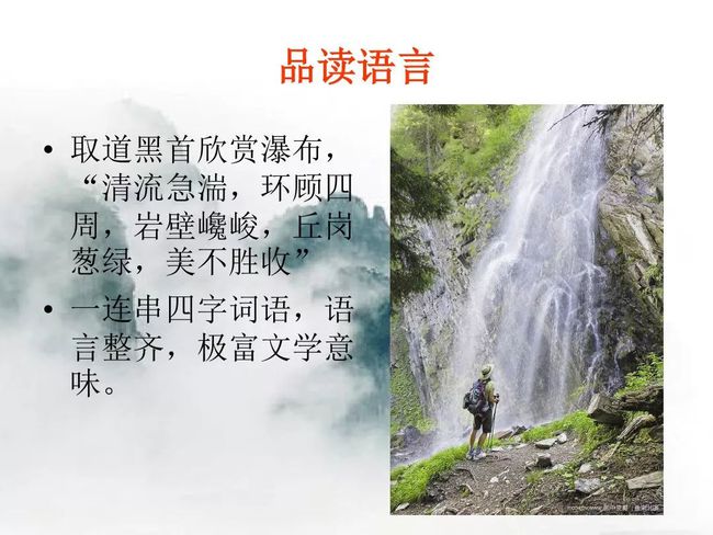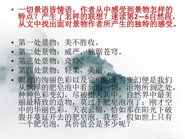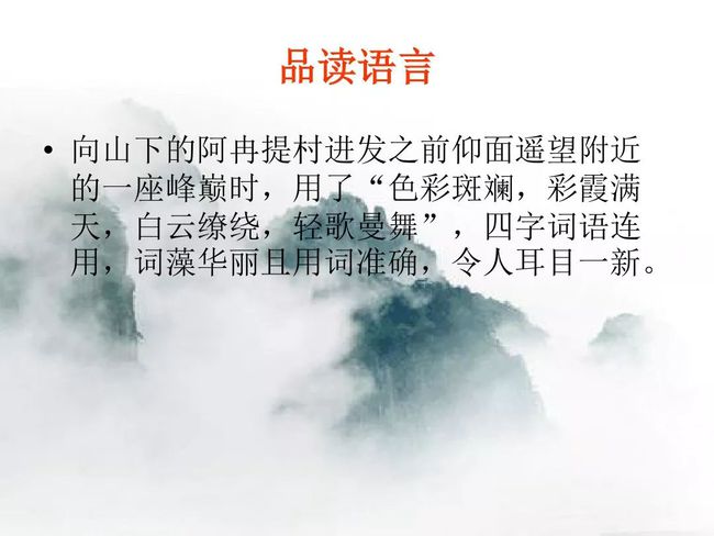 (2)大量短句的使用,让语言富有美感。如第⑤段“但见色彩斑斓,彩霞满天,白云缭绕,轻歌曼舞” ,节奏整齐,音律和谐。