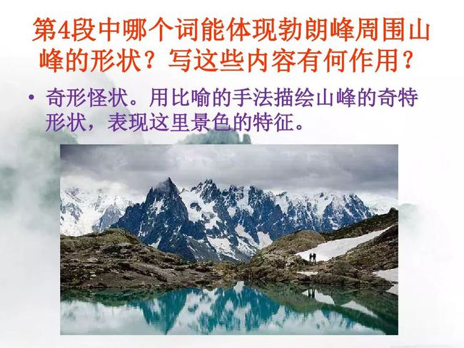 “稍作”“顷刻”“骤然”等词表明时间之短,形象地表现出了勃朗峰光影斑驳、变幻无穷的情状,勾勒出了一幅光与影变化多端的美丽图景。