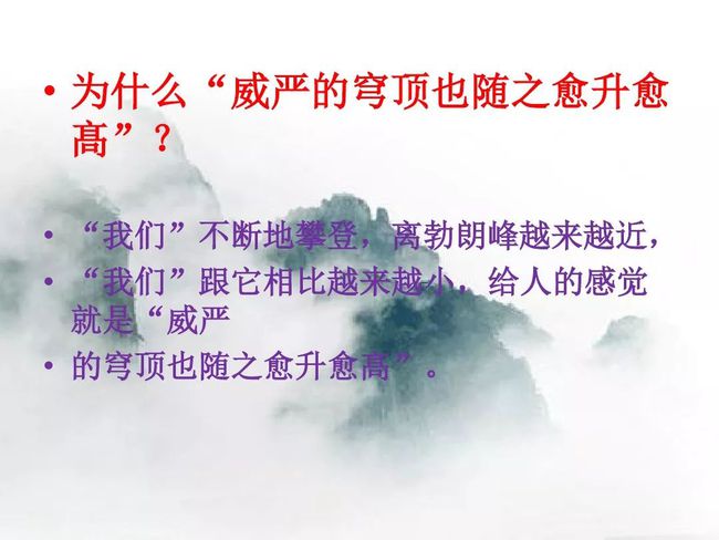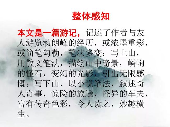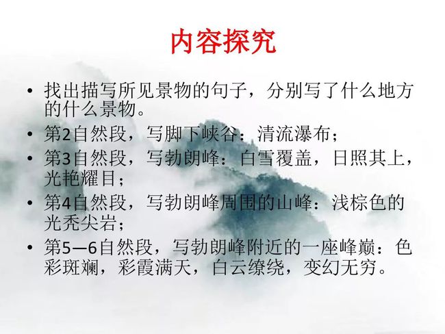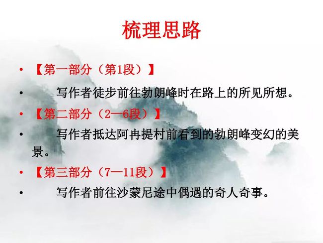 第二部分(②—⑥):描绘登勃朗峰时的所见所感。