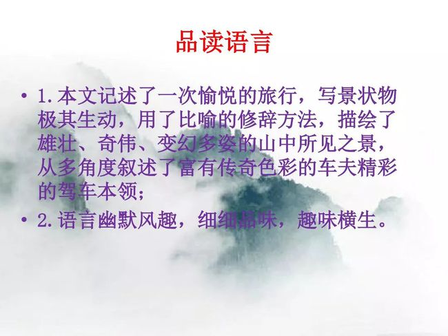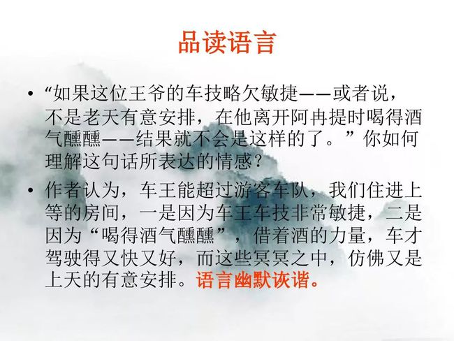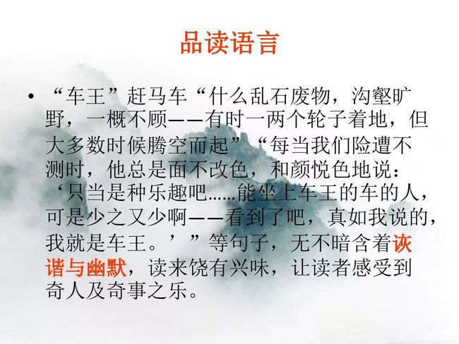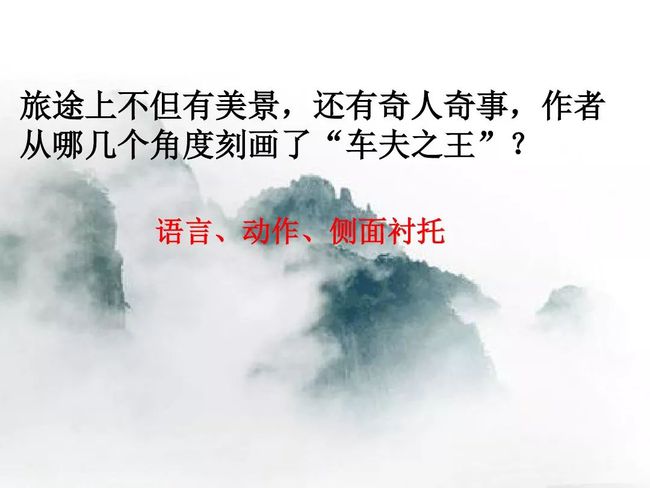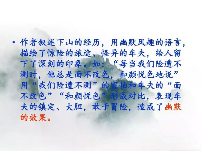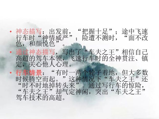 本题运用语言描写作用分析法。运用语言描写,准确细腻地写出了车夫车技的娴熟及狂妄自信的性格,为后文写下山的惊险旅途埋下伏笔。
