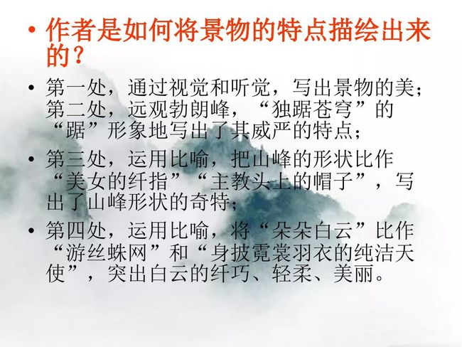 本题运用比喻作用分析法。运用比喻的修辞手法,把洁白轻薄的云朵比作身披霓裳羽衣的纯洁天使,生动形象地刻画出了勃朗峰云朵的轻柔纯净的特点。