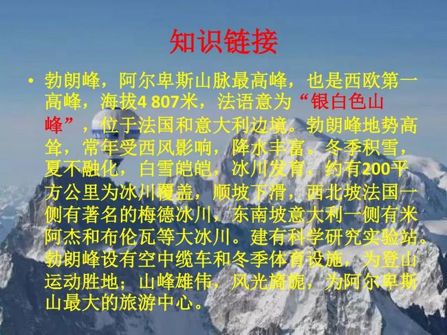 本文记述了作者与友人游览勃朗峰的经历,重点描绘了勃朗峰的美景及富有传奇色彩的趣闻逸事,表达了作者对勃朗峰的喜爱及赞美之情。