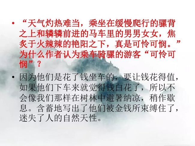 乘车骑骡的游客暴晒于烈日之下,还不能休息,作者一行人徒步上山,既可在树林中避暑纳凉,又可稍作休息。