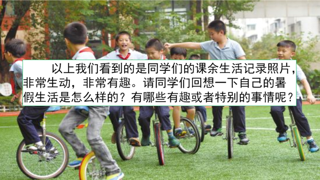 想一想你暑假经历过哪些新鲜事?哪件事是你最感兴趣的?注意选取的事情一定不能是生活中每天都能看到的,要有“新鲜”这一特点。如去天安门广场看升旗、去登长城、去海边看日出等。