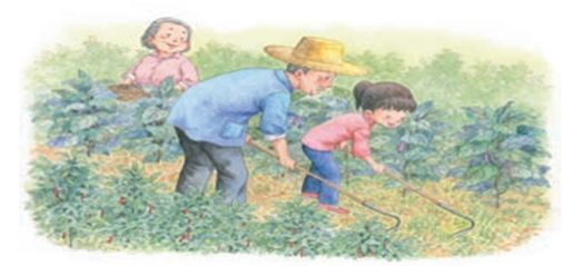 图中的小朋友是农村的孩子,和同学们交流的是跟爷爷奶奶学做农活。