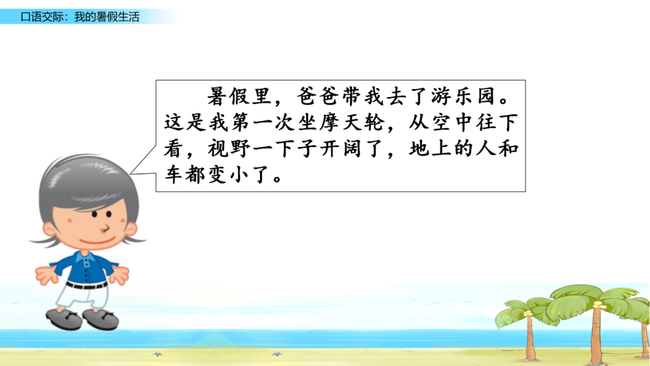 如:爸爸带我去了游乐园。这是我第一次坐摩天轮,从空中往下看,视野一下子开阔了,地上的人和车都变小了……