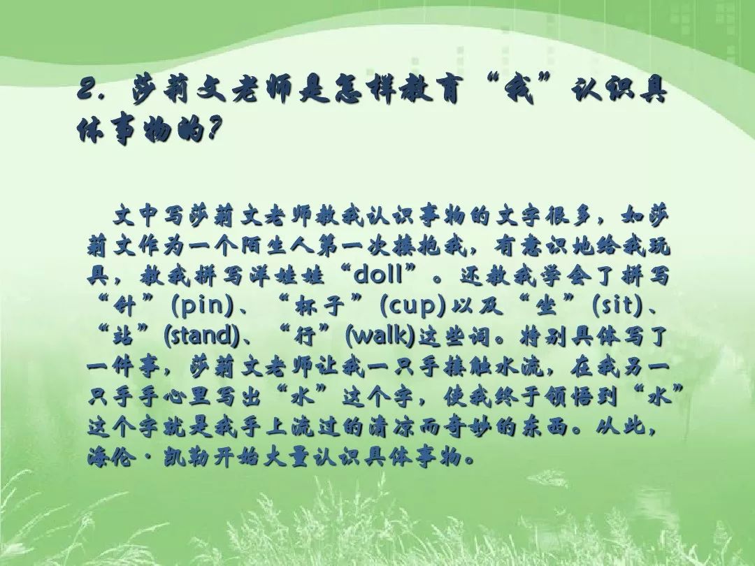 重要知识点: 一、作者简介 海伦·凯勒(1880-1968),19世纪美国作家、教育家、慈善家,是盲聋哑人。1964年,她被授予“总统自由勋章”。主要著作有《假如给我三天光明》《我的生活》《我的老师》等。 二、故事背景 海伦·凯勒在一岁多的时候因为一场高烧,失去了视力,后又失去了听力。在老师安妮·莎莉文的帮助下,海伦用顽强的毅力克服生理缺陷所造成的精神痛苦并逐渐接受教育。她以优异的成绩毕业于哈佛大学拉德克利夫女子学院,成为一位学识渊博,能够掌握英语、法语、德语、拉丁语、希腊语五种语言的著名的作家和教育家。 三、理解词义 惭愧:因为自己有缺点、做错了事或未能尽到责任而感到不安。 奥秘:深奥的尚未被认识的秘密。 拼凑:把零碎的或分散的合在一起。 疲惫不堪:疲倦得难以支持。 小心翼翼:形容非常小心。 依样画葫芦:照葫芦的样子画葫芦,比喻纯模仿,不加改变。 不求甚解:语出晋陶渊明《五柳先生传》:“好读书,不求甚解,每有会意,便欣然忘食。”现在多指读书学习只求懂得大概,不求深刻了解。 混为一谈:把不同的事物混在一起,说成是同样的事物。 恍然大悟:忽然醒悟的样子。 油然而生:形容思想感情自然而然地产生。 悔恨莫及:悔恨也来不及了。 花团锦簇:形容五彩缤纷、十分华丽的景象。 美不胜收:美好的东西太多,一时接受不完。 企盼:盼望。 四、课文分段 第一部分(第①一⑤段):写“我”初识莎莉文老师。 第二部分(第⑥一⑬段):莎莉文老师用她特有的教育方式开启了“我”智慧和情感的大门。 五、问题归纳 1.作者在文章开头为什么强调“这一天”? 因为“这一天”是“我一生中最重要的一天”,“这一天”莎莉文老师来了,是“我”生命重新开始的一天。从这一天起,“我”过上了和以前完全不同的生活。通过强调“这一天”,从侧面说明莎莉文老师对“我”的影响之大。 2.第3自然段的景物描写有什么作用? 本题运用景物描写作用分析法。通过景物描写烘托海伦期待新生的心情。 3.第4段中“在未受教育之前…… “光明!光明!快给我光明!”这句话运用了什么修辞,有什么表达效果? 本题运用修辞作用两步分析法。作者先运用比喻,形象生动地展示了“我”坠入寂静而黑暗的世界的心理状态,表现“我”在黑暗、沉寂的世界中的焦躁、恐惧。然后运用反复的修辞手法写出了“我”受教育前对光明的渴望。 4.第9段里写“我”发脾气运用了什么描写?有什么作用? 这里运用了侧面描写,写“我”发脾气,真实地写出了“我”急于想走出黑暗、沉寂世界的焦躁不安的心理。说明“我”的学习过程是如此艰难,每一点进步都需付出很多的努力,从侧面烘托出莎莉文老师工作细致、耐心。 5.为什么说“水唤醒了我的灵魂,并给予我光明、希望、快乐和自由”? “水”使“我”有了自己的思想,激起了“我”强烈的求知欲。“我”不再是仅仅限于模仿学习,而是能够敞开自己的心灵,感受到人间的光明、希望、快乐和自由。也因为有了求知欲,“我”就更能感受到生命的价值与意义。 6.“啊!世界是还有比我理幸福的孩子吗?”品析这句话的含义。 直抒胸臆,写出了“我”内心浓烈的幸福感,说明莎莉文老师为“我”开启了知识的大门,“我”学会很多文字后感到无比的快乐和幸福,感到了世界的美好。 7.“再塑生命”的含义是什么?表达了作者怎样的思想感情? 答:“再塑生命”从字面上看,是“重新塑造生命,重新获得生命”的意思。但在本文中,“再塑生命”是指“爱的光明照到了我的身上”。从这个意义上来说,莎文老师是“我”的“再塑生命的人”,表达了作者对莎莉文老师的无比敬爱和感激之情。 8.“水”本身真的有这么大的魔力吗? 答:“水”本身并没有这么大的魔力。正是对“水”的理解启发了“我”,使“我”认识到宇宙万物都有名称,使“我”有了求知的欲望,一切都豁然开朗起来。 9.为什么“我”此时会“悔恨莫及”? 答:因为此时在莎莉文老师的耐心引导下,“我”的学习终于迎来了质变,“我”终于在文字和事物名称之间建立了联系。回想起“我”因为自己的脾气而摔坏了莎莉文老师给“我”的洋娃娃,并且怎么也拼不好它,“我”十分伤心与后悔,“悔恨莫及”。 10.将题目“再塑生命的人”换成“我的老师”可以吗?联系文章内容谈你的看法。 答:不可以。“我”在莎莉文老师的教育下灵魂被唤醒,理解了自然,懂得了什么是“爱”,生命获得了新生,原有的生命被重新塑造,“再塑生命的人”这个标题很好地揭示了这个中心。而“我的老师虽然也能表达出文章的内容,但相比而言,却不能表现文章的主旨,所以,“我的老师”不如原来的标题好。 六、课文主题 这篇回忆录叙述了莎莉文老师教“我”识字、认识各种事物的过程,赞扬了莎莉文老师高超的教育艺术,表达了“我”对莎莉文老师由衷的赞美各感激之情。 七、课外知识(残疾人的事迹) 1.阿炳:二十多岁时患眼疾双眼相继失明,二胡作品《二泉映月》获二十世纪华人经典音乐作品奖。 2.奥斯特洛夫斯基:苏联作家,25岁全身瘫痪,双目失明,以顽强的意志创作了长篇小说《钢铁是怎样炼成的》。 3.张海迪:5岁时胸部以下完全失去知觉 高位截瘫,自学掌握英语 、日语 、德语等。当代知名作家、翻译家。 4.富兰克林·罗斯福:美国政治家,41岁时因患脊髓