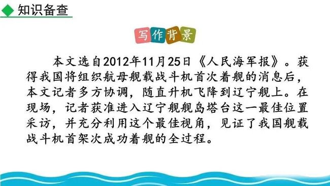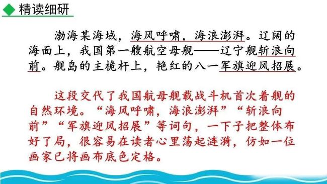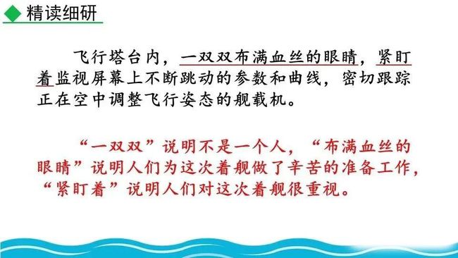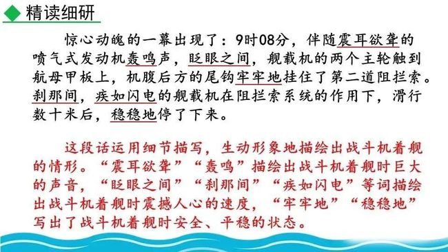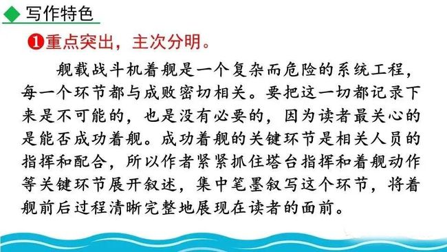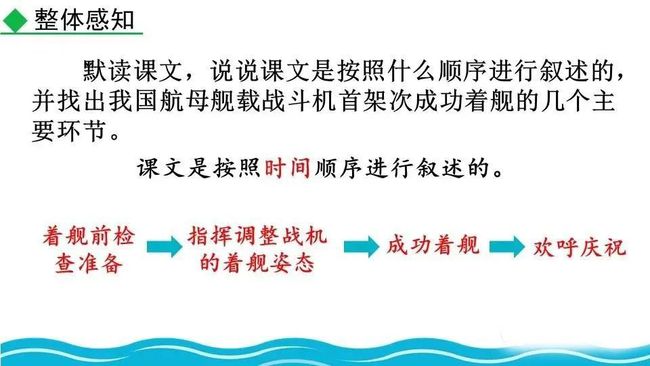 第一部分(①-④):交代着舰的环境及着舰前的准备情况,叙述此次着舰的意义和困难。