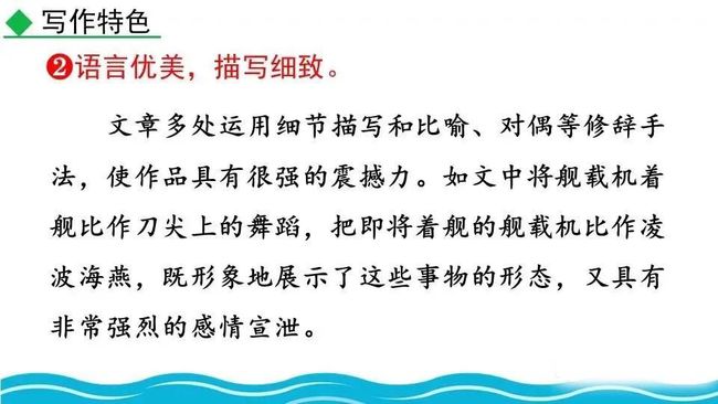 将舰载机着舰比作“刀尖上的舞蹈”,形象生动地描写出了“着舰”的艰难、危险性之大,语言生动形象,也渲染了紧张的气氛,使读者为之捏一把冷汗。
