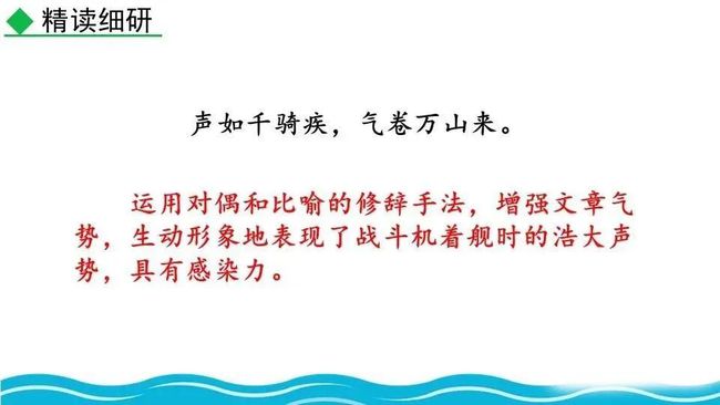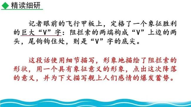 作者把舰载机成功着舰后阻拦索拉伸的情景巧妙地想象成一个巨大的“V”字,既形象展示了阻拦索的实际形态,又暗示了着舰的胜利完成,给读者带来了非常强烈的视觉效果。
