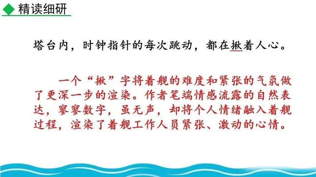 此处的对话简洁准确,让读者更加直观易懂,让舰载战斗机着舰这一个高端的试验事件更加平实,为读者揭开高科技的神秘面纱。简简单单的对话,简简单单的口令,是对当时紧张、严肃、庄重的气氛的最好诠释,在那样一个紧张的时刻,容不得人有半个多余的字。