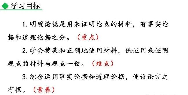 议论不仅要提出观点,还要有能证明观点的材料,言之有据,才能让人信服。用来证明观点的材料,就是论据。论据包括事实论据和道理论据。
