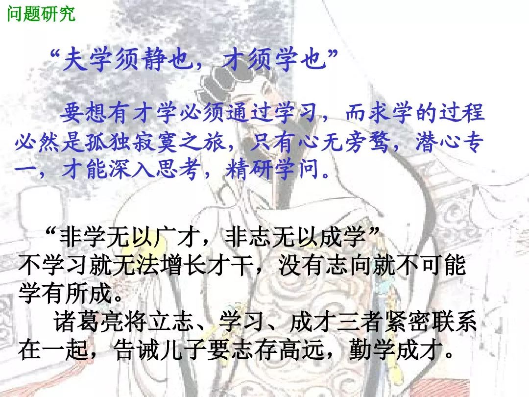 这篇作品是三国时期著名政治家、军事家诸葛亮54岁临终前写给8岁儿子的一封家书。其主旨是劝勉儿子勤学立志,修身养性要从淡泊宁静中下功夫,最忌淫慢险躁。