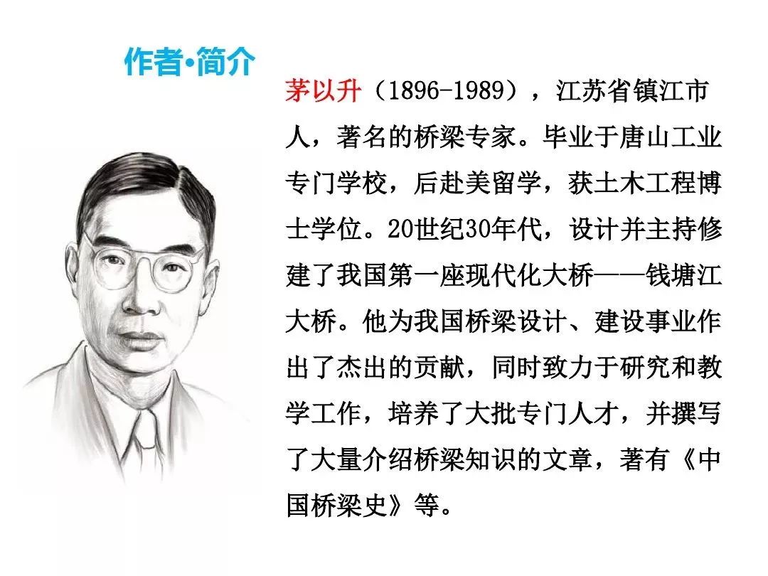 茅以升(1896—1989),字唐臣,江苏镇江人,中国桥梁学家、教育家。他主持修建了钱塘江公路铁路两用桥;还参与设计了新中国第一座现代化大桥——武汉长江大桥。他积极倡导科普教育,撰写了《桥话》《中国石拱桥》等大量的科普文章。