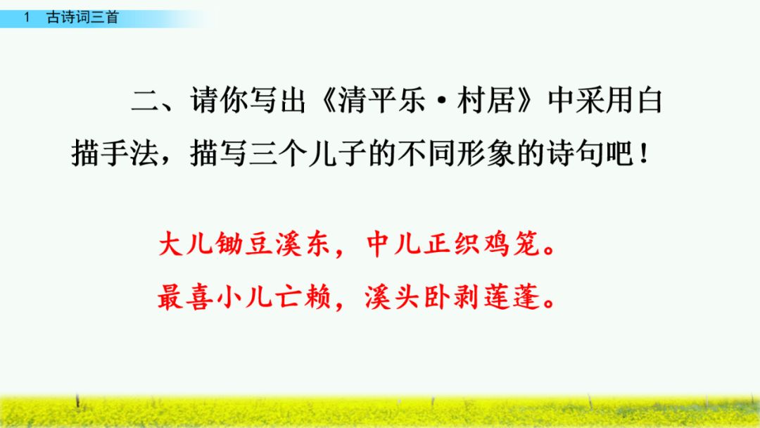 ②下片刻画了锄豆的大儿子、编鸡笼的二儿子、剥莲蓬的小儿子。重点刻画了小儿子。“喜”和“卧”用得好。“喜”字可以说是这首词的点睛之笔。小儿子的顽皮和淘气,为这幅乡村图增添了更为祥和更为温馨的气氛,使它霎时有了生机,有了光彩。“卧” 字使用得最妙,它把小儿子躺在溪边剥莲蓬时的天真、活泼、顽皮、可爱的样子和盘托出,从而使人物形象鲜明,意境耐人寻味。