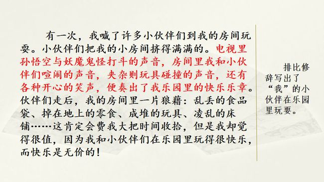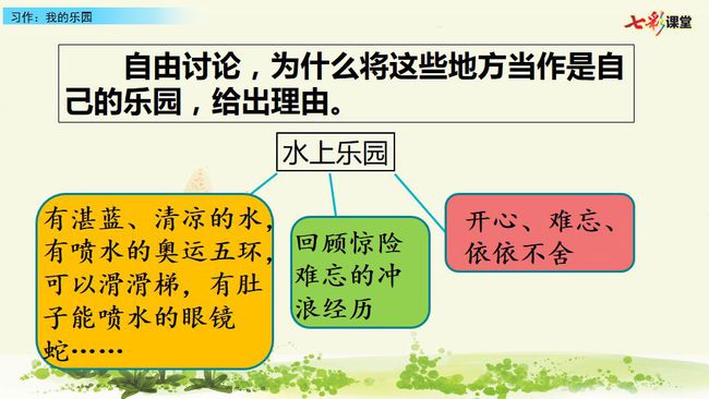 点评:这篇文章作者通过选取“采蘑菇”“滑梯”“捉迷藏”等几件小事,不仅表现了休闲广场里形式各样的活动,更表达了休闲广场给“我”带来的乐趣,是名副其实的“乐园”。