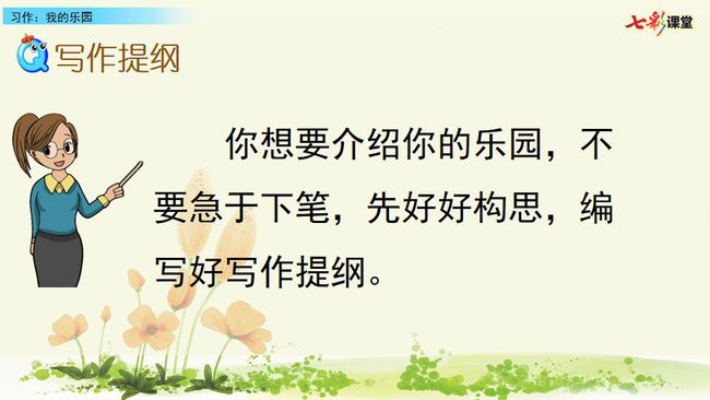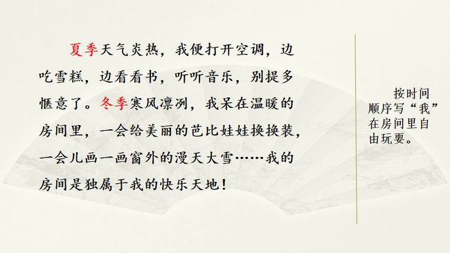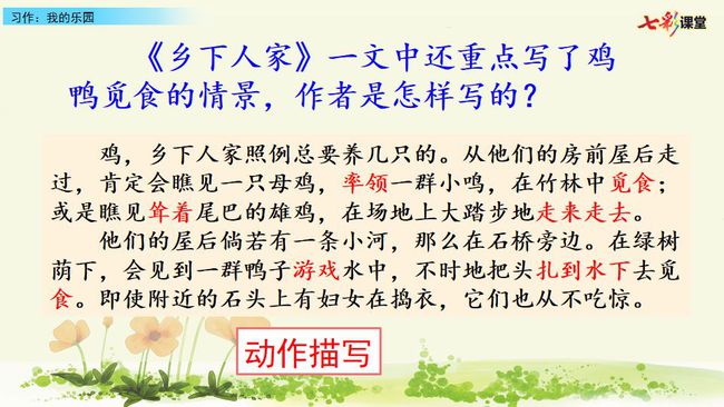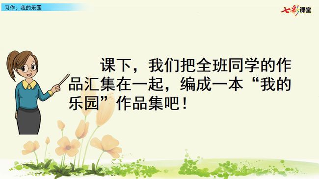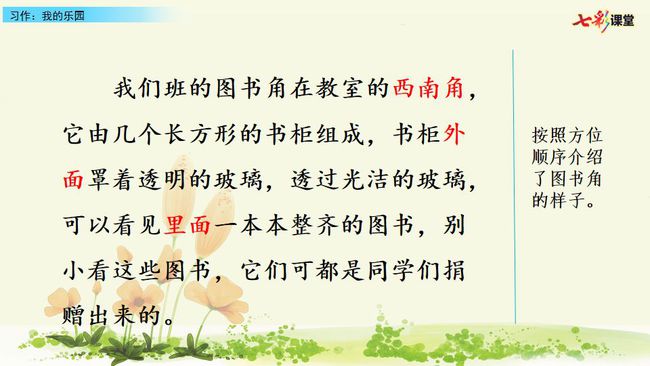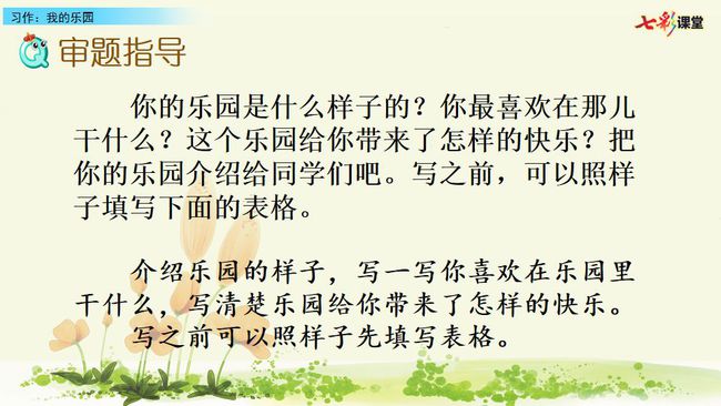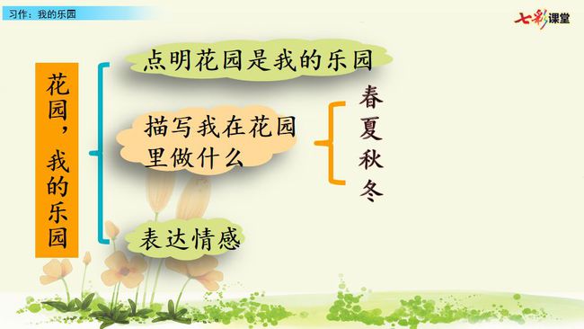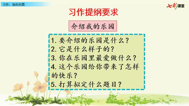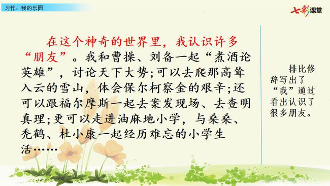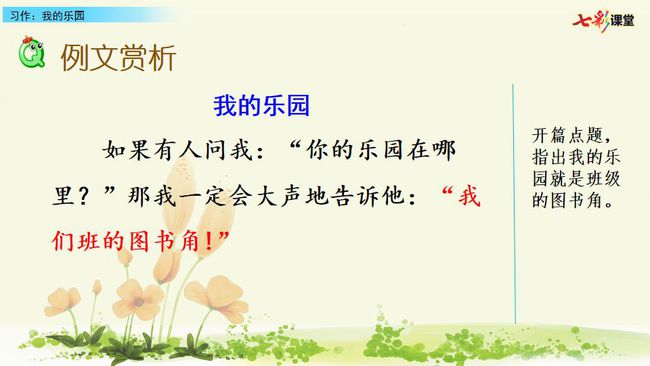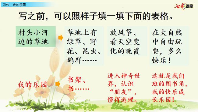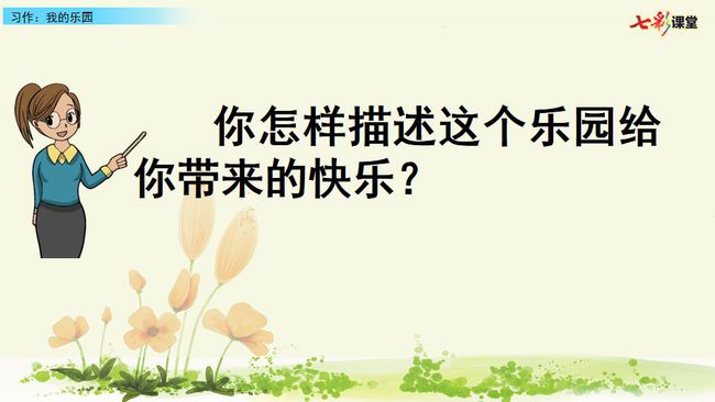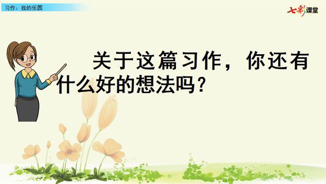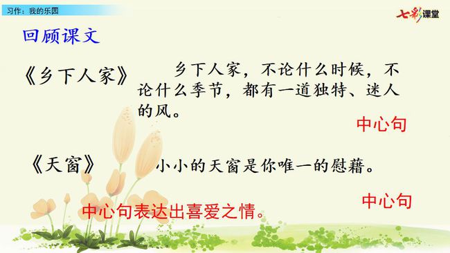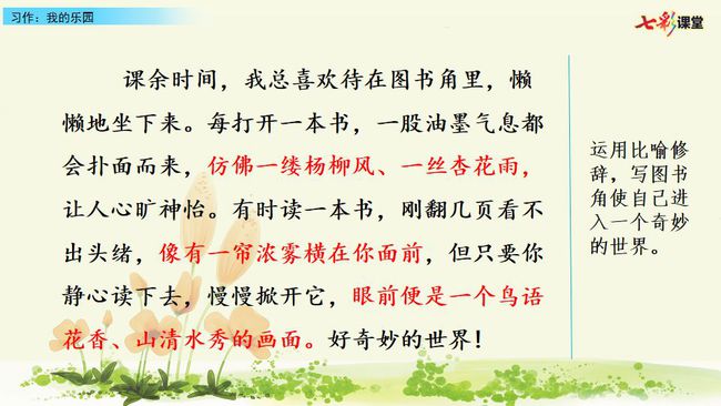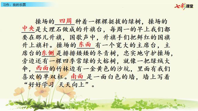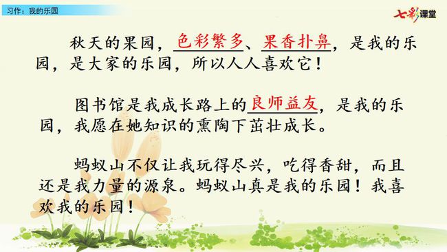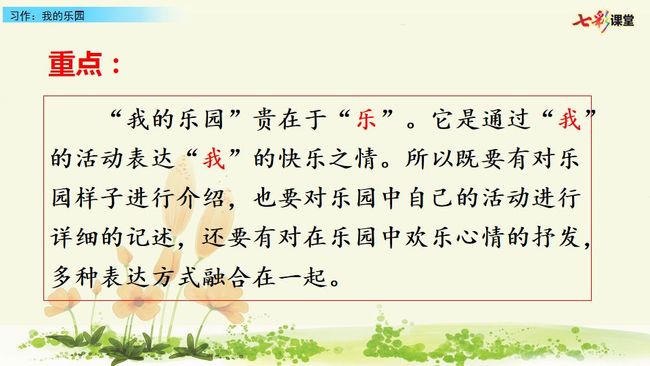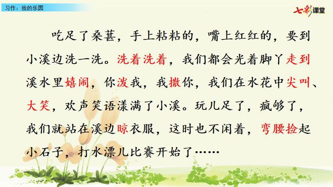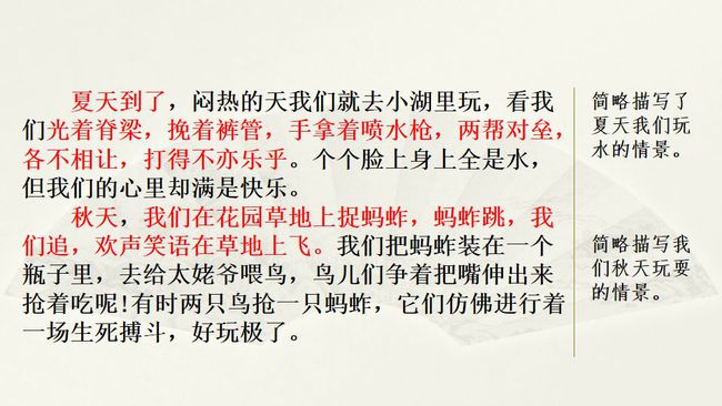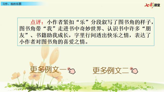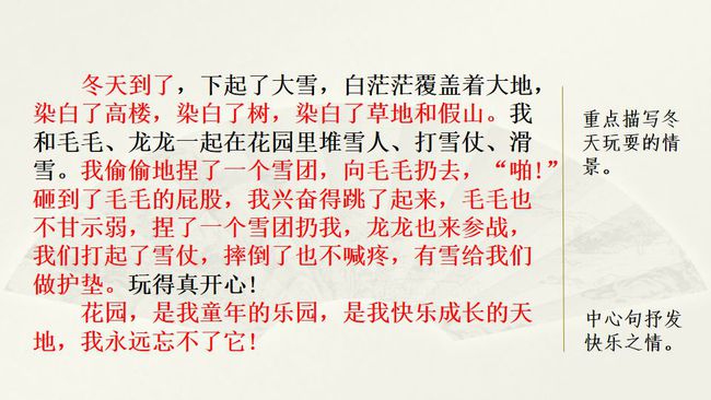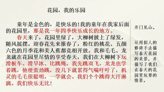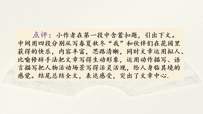 点评:这篇文章需要写出景物的内容,抓住重点景物写,写出在景物里做些什么,带给自己怎样的快乐,写出自己对景物的赞美和喜爱之情。