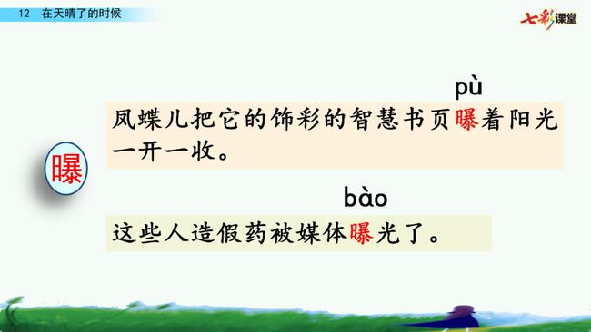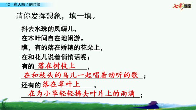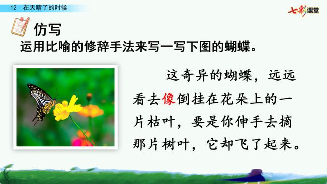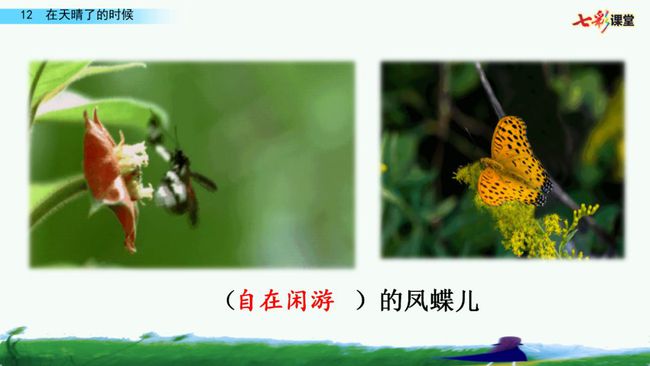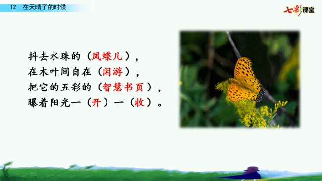 4、抖去水珠的凤蝶儿在木叶间自在闲游,把它五彩的智慧书页,曝着阳光一开一收。