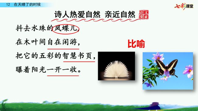 “闲游”一词表现了凤蝶儿的自由与快乐,体现了雨后的美好。“智慧书页”采用了比喻的手法,形象的描写了凤蝶儿翅膀的美丽。“曝着阳光一开一收”描写了凤蝶的动态美,显示着生命与活力。