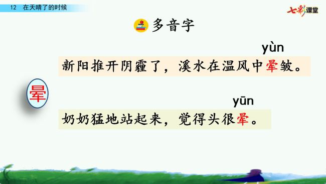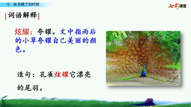 “炫耀”是夸耀的意思,作者用拟人的手法写出了小草的快乐与自豪;“洗净”一词写出了雨后小草的洁净与清新。