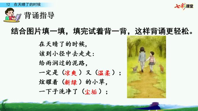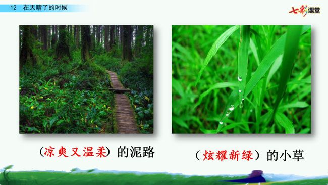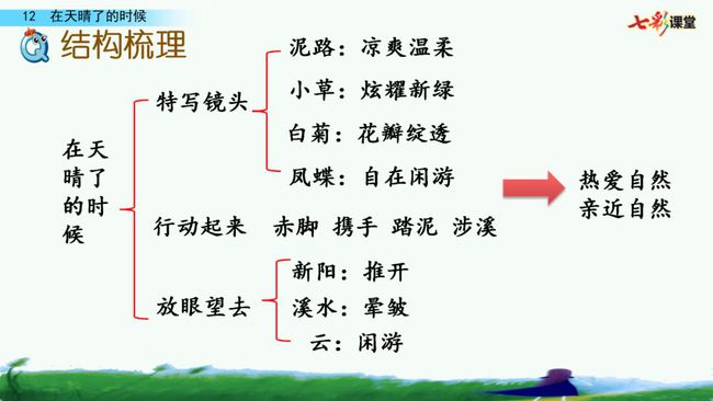 第一部分(1):诗人选取了泥路小草、小白菊、凤蝶儿四种事物,刻画了雨后小径的优美与清新。