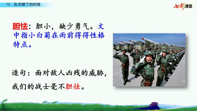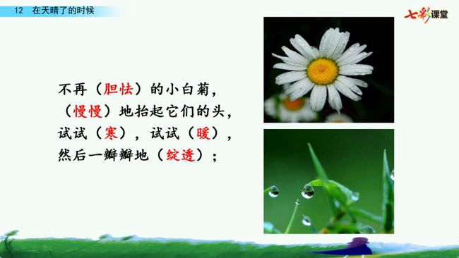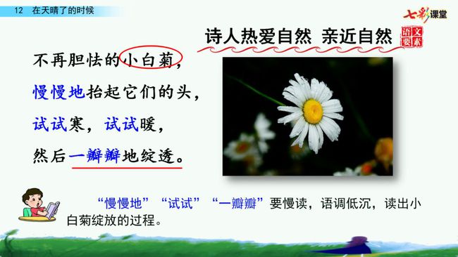 “胆怯”形容小白菊经历了风吹雨打。“慢慢” “试试”描写了小白菊的谨慎,表现了小白菊的可爱与美好。