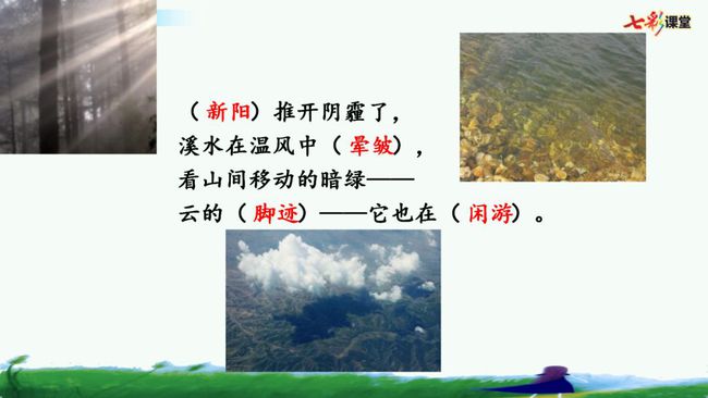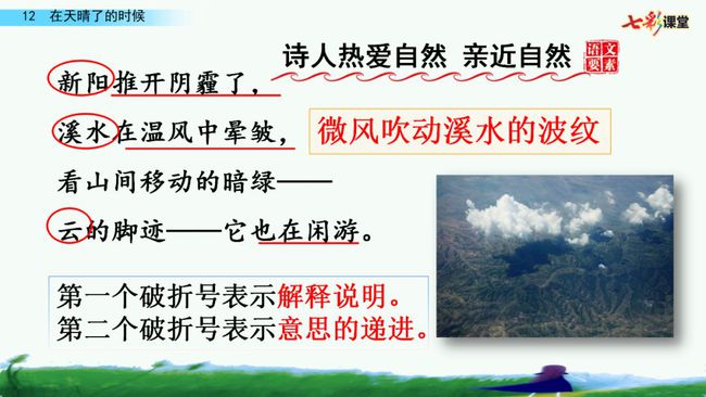 “推开”一词采用了拟人的手法,描绘出太阳的力量是伟大的。“晕皱”一词表现了溪水的陶醉与美丽。“云的脚迹一一它也在闲游”在诗人的笔下云是有脚的,云是浪漫的,云是在悠闲地散步。