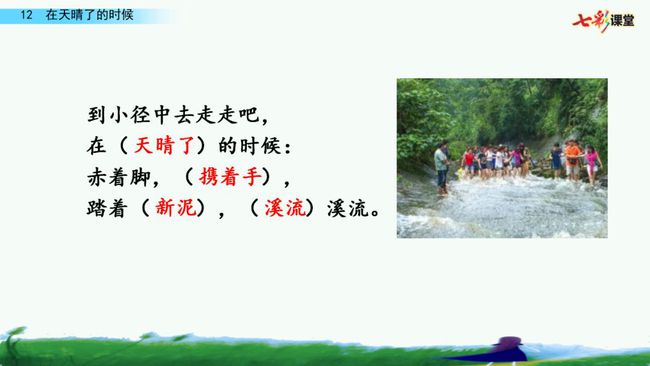 “赤着脚”让赤裸的双足与柔软的泥路亲昵地接触,充分地享受泥路的温柔;“携着手”与朋友、家人一同出游,一起享受雨后清新的空气和美好的景物。“踏着新泥,涉过溪流”一味地往前走让雨后大自然的泥土与流水在足下经过,让所有的美景尽收眼底。