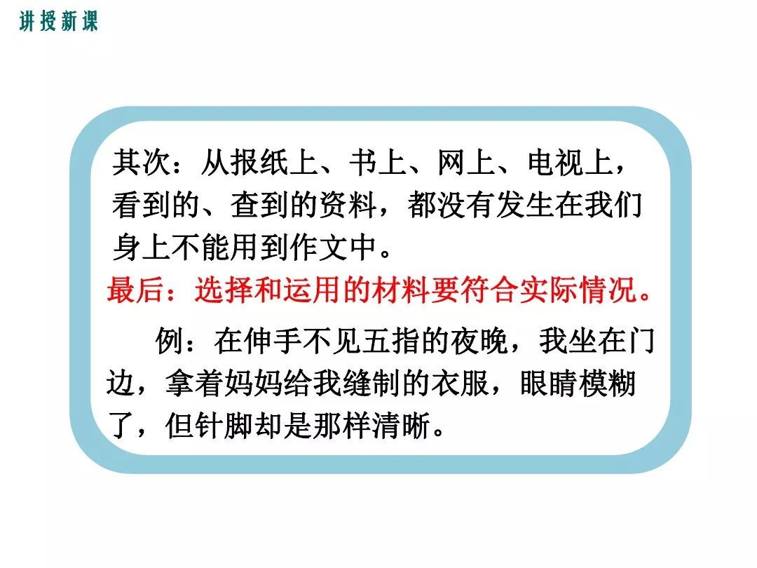 选材时要有“自知之明”,选取自己熟悉的真实材料(亲耳所闻的、亲眼所见的、亲身经历的、深切感悟的、了然于心的……)这样才能得心应手。
